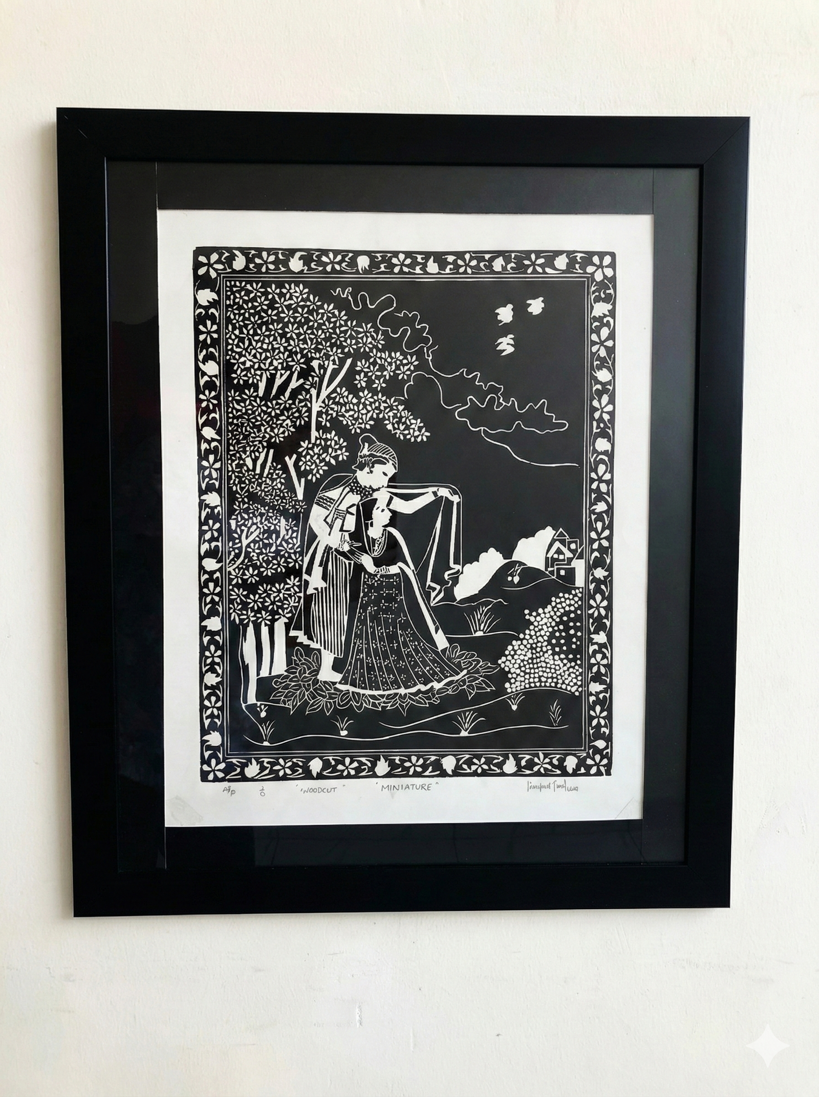 Divine Union” is a soulful interpretation of the eternal bond between Radha and Krishna. Unlike typical colorful bazaar prints, this monochromatic woodcut strips away the noise to focus on the pure emotion of the moment.