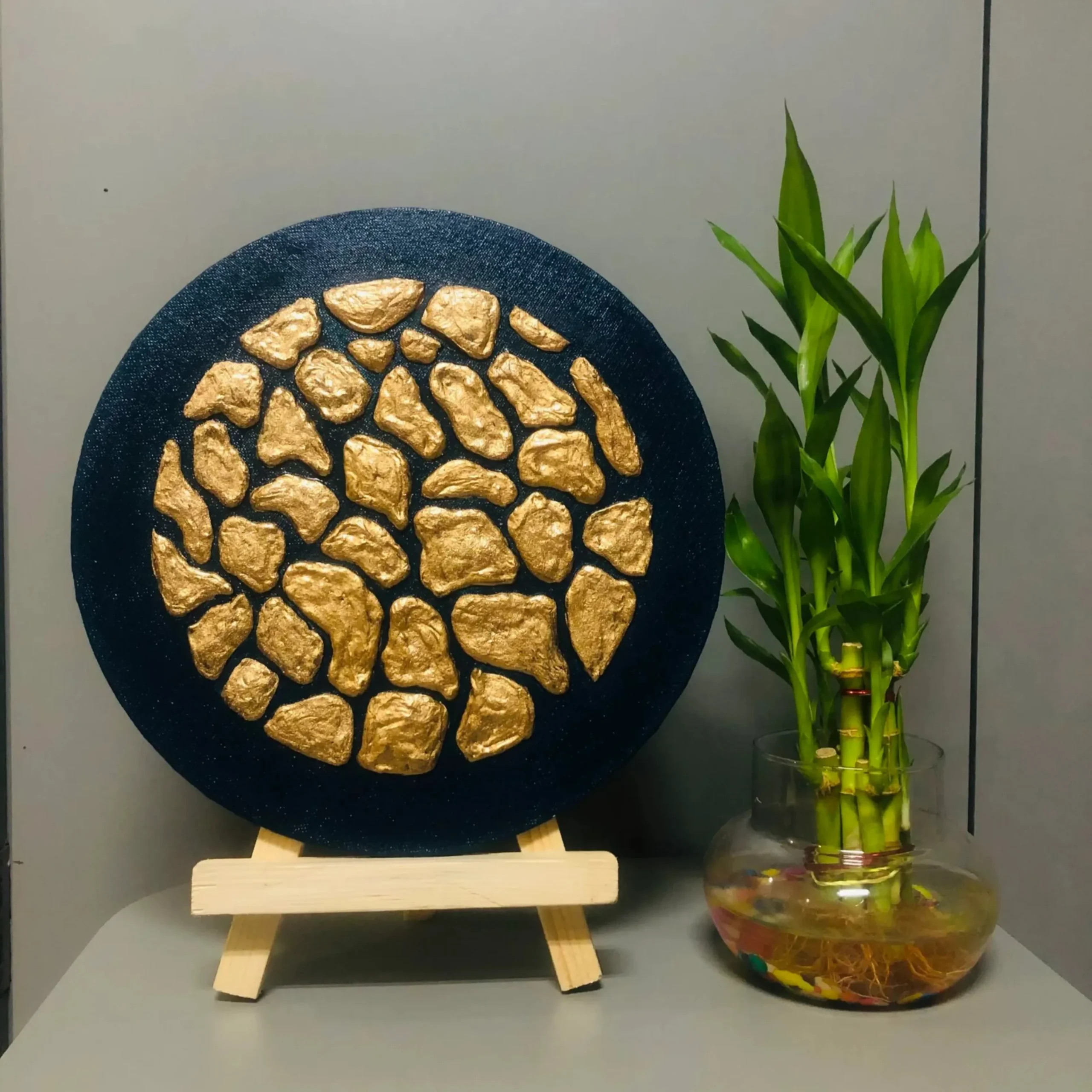 Gilded Midnight” is the perfect way to add a touch of art to your workspace or living area without needing a hammer and nails. Designed specifically as a tabletop accent, this piece brings texture and warmth to any flat surface.